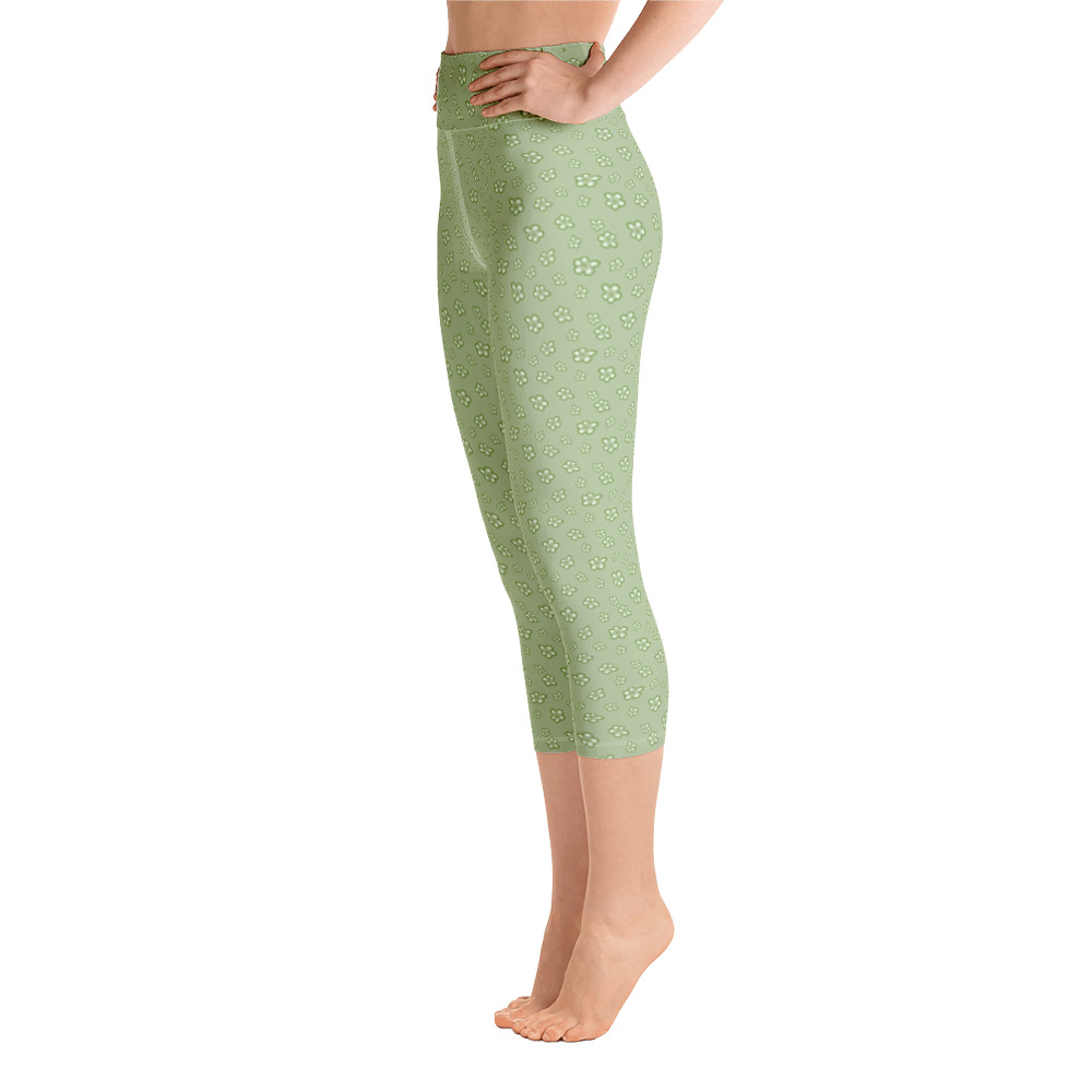 FLADDRA gröna caprileggings. Sköna vadlånga tights med ett mönster av flygande blommor. Blommorna är ca 1-2 cm breda. Tillverkade i mjuk och bekväm fyrvägsstretch i mikrofiber, med extra bred resår i midjan för maximal komfort och liten nyckelficka på insidan av linningen. Passar att bära till kjol, tunika eller tröja och är även utmärkta till träning och dans. Beninnerlängd ca 55 cm i strl L. Sömmarna är vita. Byxorna är tillverkade i Europa.