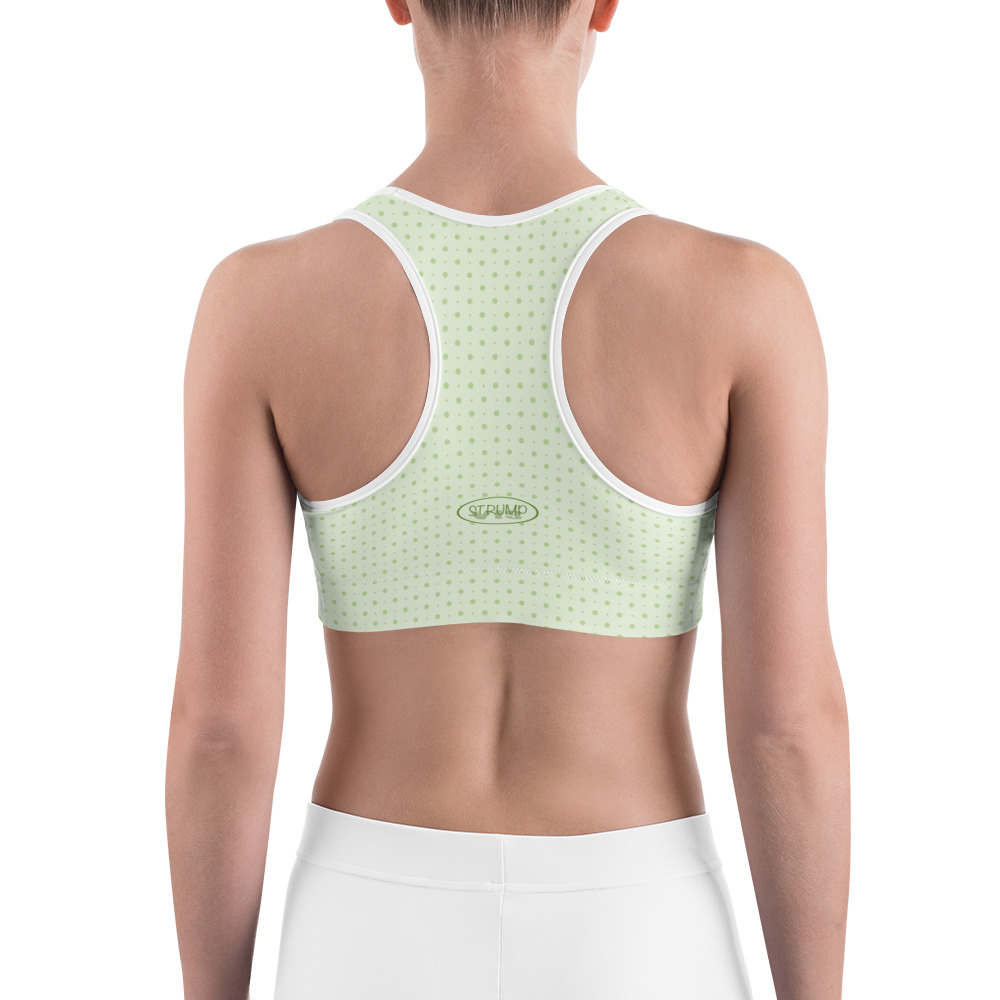 PRICKIG grön sport-BH. Bekväm med brottarrygg i ett mönster av stora och små prickar. De stora prickarna är ca 1/2 cm. Ärmhål och halsringning har vita kantband i mjukt material för att inte skava. BH:n är tillverkad i mjuk och bekväm fyrvägsstretch i mikrofiber av högsta kvalitet som transporterar bort fukten från huden. Den har bred resår under bysten och breda band på axlarna och dubbelt tyg i främre delen för extra stöd. Sömmarna är vita. BH:n är tillverkad i Europa.